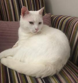 Albie is still very playful and will run round the house chasing his toys. Even though he is white, he keeps himself clean! He enjoys going outside in the garden but does not go far from home.
