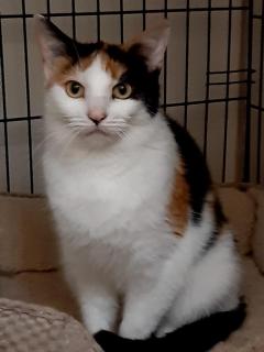 Kitty is a beautiful calico girl. She is a gentle sensitive cat, who quietly makes a lovely companion. She is gentle to take treats from your hand and sits up like a meercat waiting for her food and is used to being brushed while she's eating.