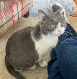 Flora is a pretty grey and white cat. She is initially shy but once she knows you, she becomes affectionate and purrs. She is scared of men. Flora likes to be stroked and enjoys a lap to sit on. She is timid around strangers and can be easily startled by sudden movements or loud noises. Flora would benefit from a quiet female only home, with an understanding owner, who will allow her time and space to grow in confidence.