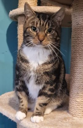Hobbes is a handsome boy. He had been a stray for a long time and led a difficult life on the streets, he was scared of everything when he arrived in foster care. He has made good progress and can be stroked and picked up but he is still nervous with strangers. He would benefit from a quiet home with a relaxed, patient owner, who has no expectations of him and once he has settled, is willing to allow him to come and go as he pleases.