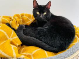 Juno is a gorgeous black cat! He is a big softie, extremely affectionate, loves cuddles and tummy rubs. He will lie at your feet to lure you in for more strokes. He will be a welcome addition to any home.