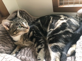 She came to us having given birth to 5 kittens in a garden shed. The kittens have all been homed now and Molly is ready for her own home. She is a gentle cat, who has never bitten or scratched despite her various ordeals. She loves to have a scratch behind her ears and will roll over for a tummy tickle. She is unfazed by vacuuming or garden machinery. She needs a home where she will be given her own space but also plenty of attention.