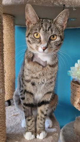 Nimbus is a stunning young tabby cat with beautiful markings. She is very vocal and always has something to say! She is friendly and affectionate and enjoys a cuddle. She loves playing with her toys.