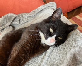 Tally is an older but beautiful cat, who loves affection and warm places to sleep. Once Tally sees you sitting down, she will shamelessly come up and want to make herself comfortable sitting on you. Though she's not as able as she once was, she is stiff in her back legs, she can still go up and down the stairs and is determined to get onto the sofa. She likes to be carried around so she can see out of the windows!